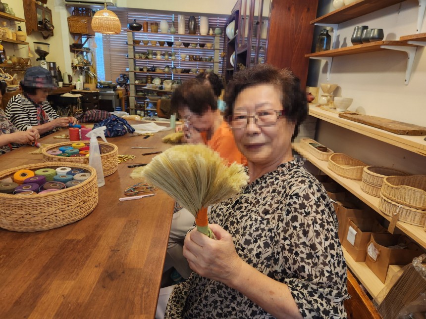 손이 많이 가는 작업이었지만, 여러 색의 실로 손잡이를 엮고, 빗살을 곱게 다듬으며 어느새 모두 자신만의 예쁜 빗자루를 완성하셨습니다.